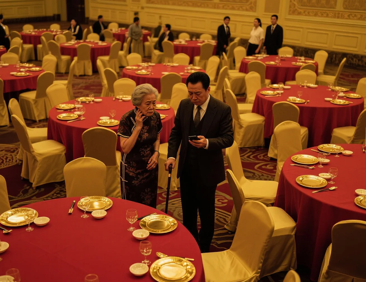 李美娟指着偌大的宴会厅,声音都在颤抖。28张圆桌整齐排列,红色桌布、金色餐具闪闪发光,可放眼望去,稀稀拉拉只坐了15个人。